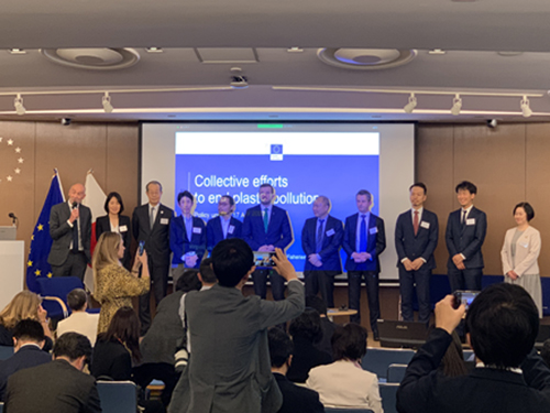 写真はこの会合が行われた翌日4月17日(月)に東京で行われた、EU(欧州連合)主催のセミナー”Creating a Circular Economy for Plastics to End the Plastic Pollution(プラスチック汚染を無くすためのプラスチックの循環型経済をつくる)”の様子。