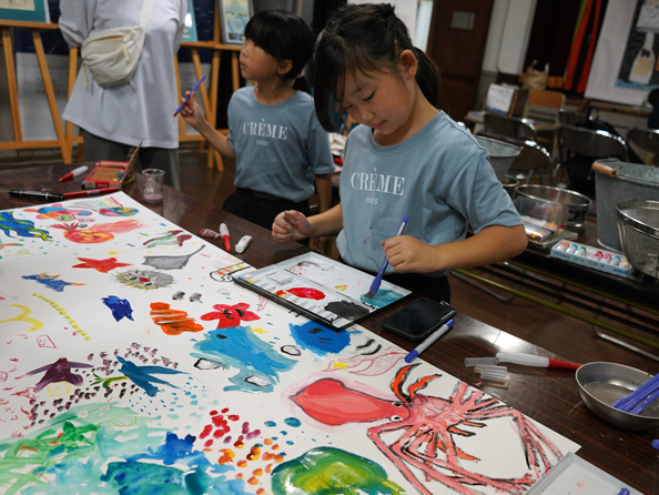 室内に戻ったあとは、イラストレーター花咲マリサさん主導の元、子どもも大人も一緒に大切な海の生き物をテーマにした共同アートを制作。皆で描いたことで、温かい一体感が生まれました。