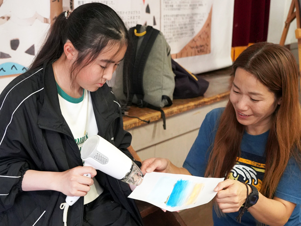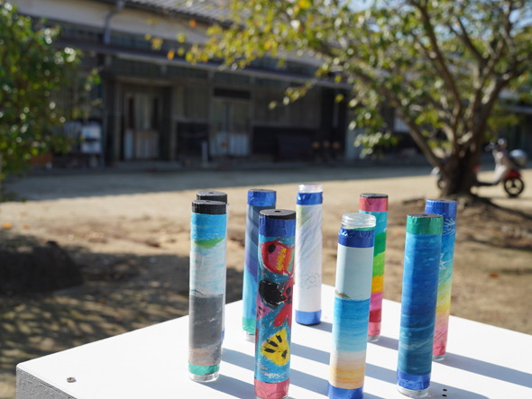 室内に戻り、いよいよ粟島の思い出のアート制作です。前日に拾ったシーガラスやマイクロプラスチックを使い、外側は各々好きな絵を描き、オリジナル万華鏡が完成しました。