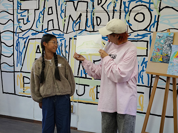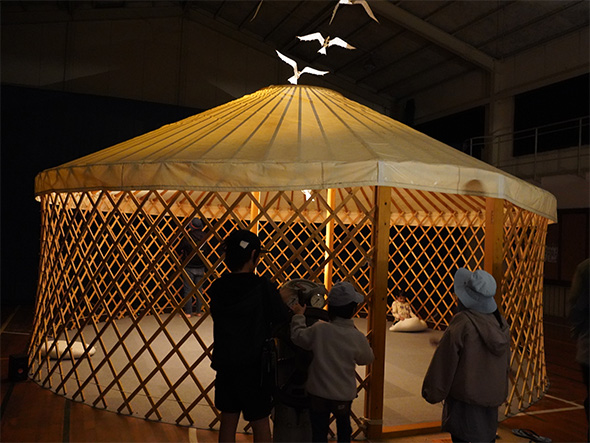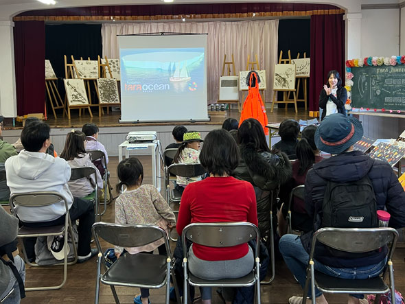 この講堂は普段タラ オセアン関連のアート作品を展示している場所で、瀬戸内国際芸術祭2025に向けて今年リニューアルされたばかり。アート作品に囲まれ、子どもたちも保護者の皆さんも興味津々でした。空き時間には、ほかの展示作品も鑑賞できました。