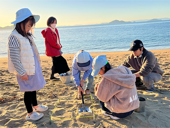 その後は、西浜に移動してビーチクリーンへ。どんなゴミが落ちているか観察し、科学者が行うようなマイクロプラスチック採取も体験。目に見えにくい小さなプラスチックがたくさんあることを実感してもらいました。
