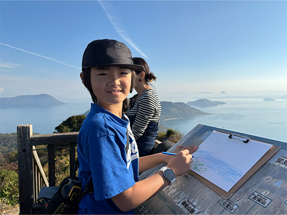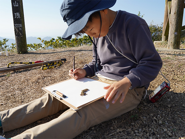 山頂では、少しかすんでいたもののここからしか見えない”多島美”の風景を眺めながら、美しい景色やつかまえたトカゲのスケッチを楽しみました。