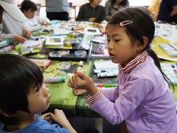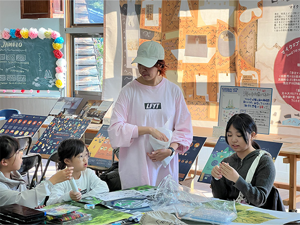その後は室内に戻り、いよいよアート制作。前日に拾ったマイクロプラスチックを使い、外側にはそれぞれ好きな絵を描いて、オリジナル万華鏡が完成。粟島の猫を描くなど、島での思い出が詰まった作品が出来上がりました。