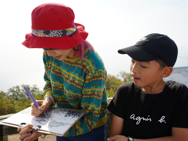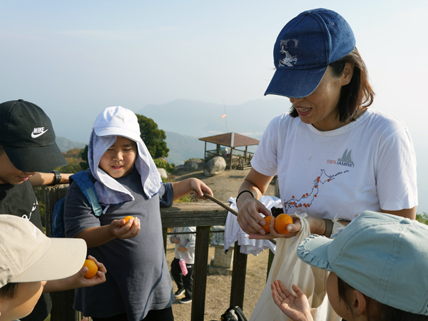 2日目の朝は山登りからスタート。天気が良いと瀬戸内の多島美を堪能できる城ノ山ですが、この日はあいにくのお天気。それでも山頂で食べる地元のみかんはとてもおいしく、子ども達のみかんへの情熱が露わとなりました。山頂では、スケッチも。
