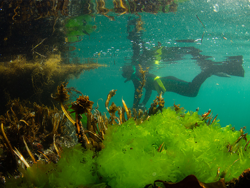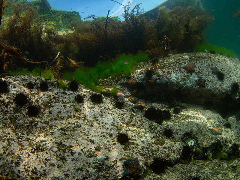 忍路の藻場には、北海道ならではのホソメコンブをはじめ、ホンダワラやアオサなど多様な海藻が確認されました。しかし同時に、大量発生したウニによる「磯焼け」も見受けられました。ウニの密集する場所では藻場が失われ、海底が荒廃している様子がはっきりと分かりました。