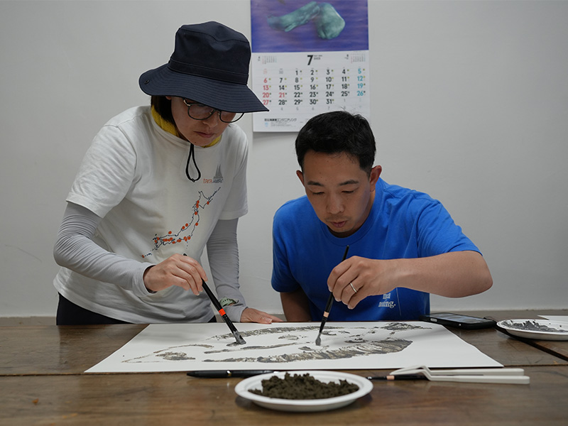 香川、佐渡に続き、忍路でも「泥で描くワークショップ」を調査中に開催しました。研究者もアーティストも分け隔てなく参加し、ほぼ全員が作品を制作。