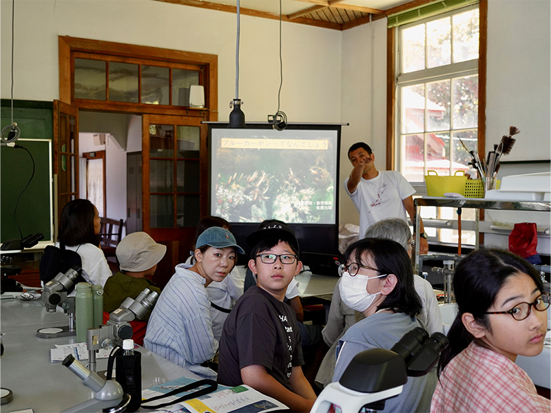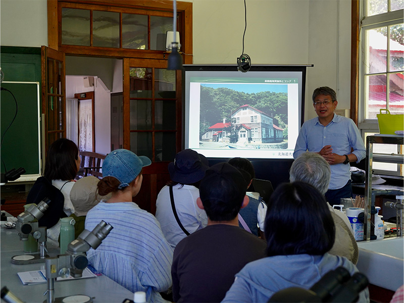 続いてラボ内でセミナーと実験・観察を行いました。北海道大学の四ツ倉先生からは、忍路臨海実験所の歴史や、研究対象であるコンブについて詳しいお話を伺いました。札幌や小樽から参加した方々にとっても、身近な海・忍路の自然について新しい学びの機会となりました。