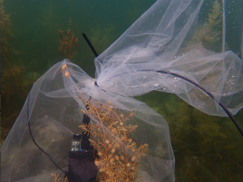 海藻藻場の調査は、実験所から船で数分の達者海岸北部の岩礁帯で行われ、ここはホンダワラ類の海藻が豊富なエリアです。