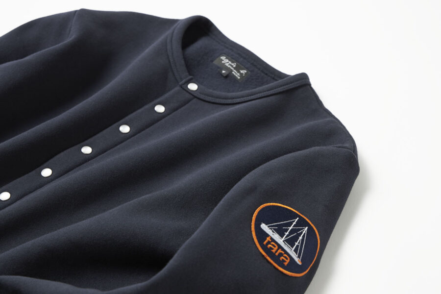 アニエスベーのアイコニックアイテムでもある、カーディガンプレッションは海を連想するネイビーカラーにタラオリジナルのワッペンが入った特別なデザイン。そのほか、Tシャツやキャップ、バッグなどのラインアップです。